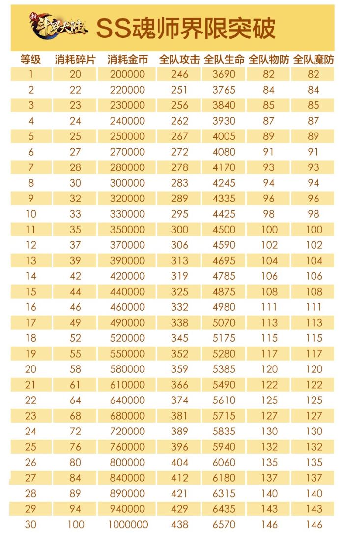 同样在这里提供一下SS和SS+魂师界限突破各级的消耗与提供属性,供大家参考。