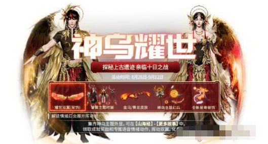 在十日战场中使用月牙锄探宝可得神乌耀世主题系列外显,包括神品金乌主题时装、饕餮主题时装、金乌骨龙日曜皮肤、金乌主题幻兵、像素风格屋脊装饰等。