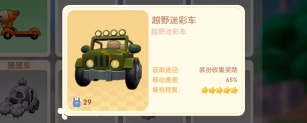 玩家在游戏内收集“夏日甄选”系列服装,完成全部29套服装的获取收集后,即可解锁越野迷彩车载具奖励,这个载具的稀有度为5星,入手还是有一定难度的。
