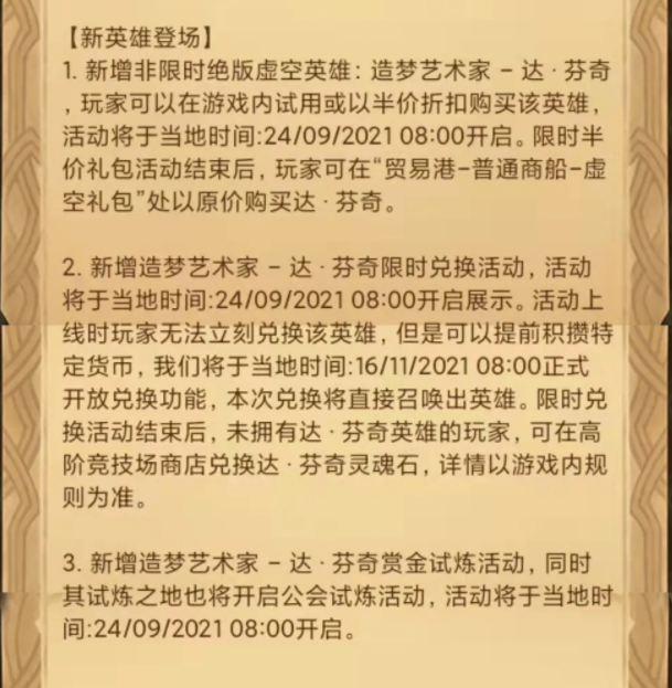 1.新增非限时绝版虚空英雄:造梦艺术家-达·芬奇,玩家可以在游戏内试用或以半价折扣购买该英雄,活动将于先锋服时间:2021/09/24 08:00开启。限时半价礼包活动结束后,玩家可在“贸易港-普通商船-虚空礼包”处以原价购买达·芬奇。