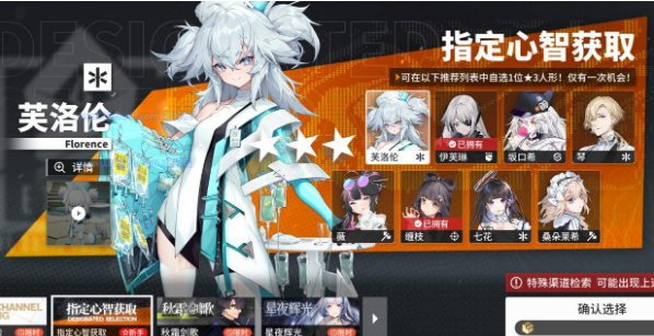 1、在指定心智获取卡池中的9个角色分别是芙洛伦、伊芙琳、坂口希、琴、薇、缠枝、七花、桑朵莱希;