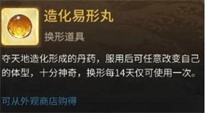 -消耗造化易形丸,可以进行换形,可改变仙友的体型和性别,并对仙友的时装、道侣关系进行对应调整,每14天仅可使用一次换形