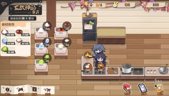 活动场景(餐厅)一共有三个区域,食材区,厨房和销售柜台。其中,食材区按时间自动恢复,厨房和销售柜台需要放置女武神来工作。