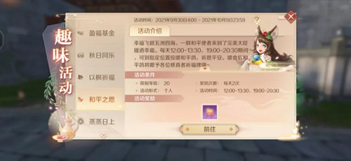 在9月30日4:00-10月9日23:59期间,每天12:00-13:30分、19:00-20:30分期间,可到指定位置投喂和平鸽,祈愿平安。喂食后和平鸽将赠予各位修真者祈福牌喔~