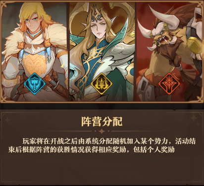 勇士报名后将由系统随机分配加入蛮荒之角、师皇之心,悠远之翼三个阵营,互相为敌呈三方逐鹿之势!!