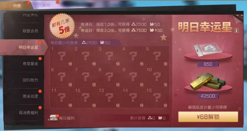 2、幸存者每日可在活动界面领取当日福利,购买明日幸运星后,每日更可获得高倍率奖励,最高有机会获得5倍奖励;