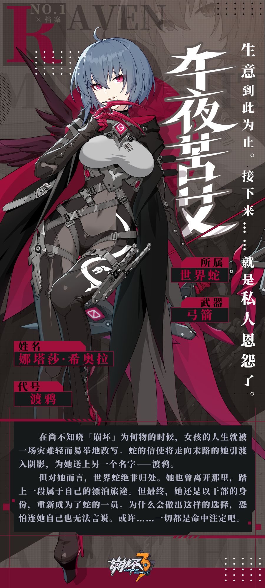 在尚不知晓「崩坏」为何物的时候,女孩的人生就被一场灾难轻而易举地改写。蛇的信使将走向末路的她引渡入阴影,为她送上另一个名字——渡鸦。