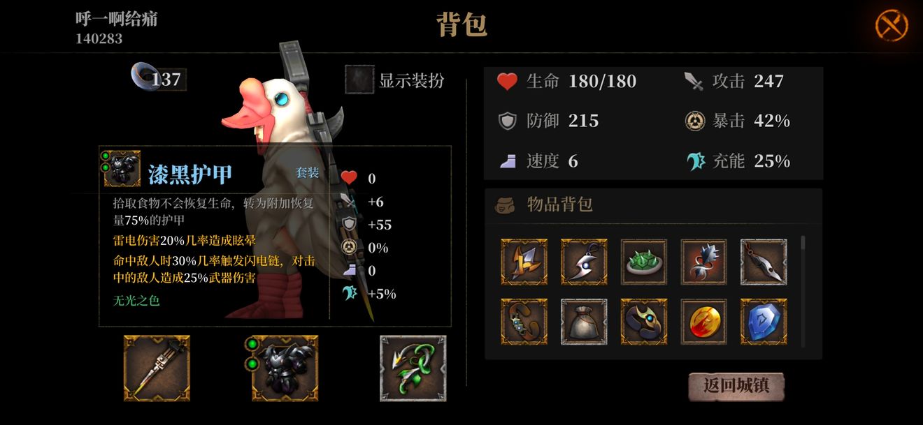 主武器副武器推荐“冲击弩”+“箭之纹章”,冲击弩高攻击频率可以有效触发雷电及大鹅和雷电圣物的晕眩,二是攻击频率快,副武器回复的也快,两个蓄力平A可以充满箭之纹章,出了附魔手镯就更不用说。剩下的就看自己运气和操作了,运气好出了“雷电手镯”命中敌人25%几率出现落雷,基本一直在晕眩,稍微会动弹几下。刷图带群攻和集体眩晕,单打晕眩配合箭之纹章的高输出也是很顶。