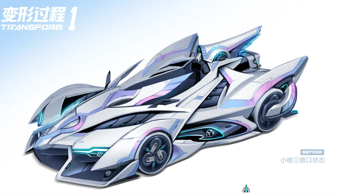 除此之外,赛车融入了天马与骑士的理念,在造型设计上和车身点线面切割上做了近似以上两种感觉的表达,变形完成后翅膀元素的结构大量展开露出。