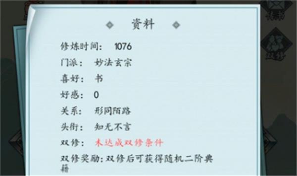 3、通过不断的给对应的角色进行送礼,在好感度达到56或以上时,可以顺利的开启双修玩法。