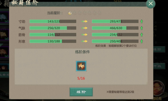 4、以上都弄好后,就可以对秘籍进行升阶了,升级道具可在“奇珍阁”购买,秘籍升阶后,能大幅提升秘籍的各项能力,同时解锁更多“要诀”孔位,装配更多“要诀”,让秘籍的威力进一步提高。