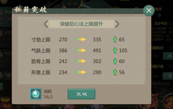 5、最后就是对秘籍进行升级和突破了,在日常升级过程中,秘籍会跟随角色一起升级,因此一般情况下不同特意升级,但是当秘籍等级达到等级上限后,需要使用“领悟丹”进行突破,突破后秘籍即可继续升级。