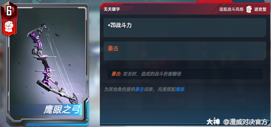 鹰眼之弓:虽然是锁定卡池里的卡牌,但同时增加暴击与高额战力两个效果使其极其适配鹰眼暴击套。装配给鹰眼、红浩克、勇度等角色可以达成满场暴击的效果,是红队极其优质的武器。