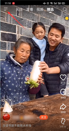 1、打开手机抖音火山版,点击左上角的三条横杆,