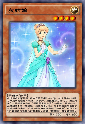 灰姑娘可以拉南瓜马车和玻璃鞋。南瓜马车可以令灰姑娘直接攻击,同时可以保护金宫不被取对象也不会效果破坏。玻璃鞋可以为灰姑娘提供加攻效果,还可以在灰姑娘直接攻击完后装备到对方怪兽上降攻。