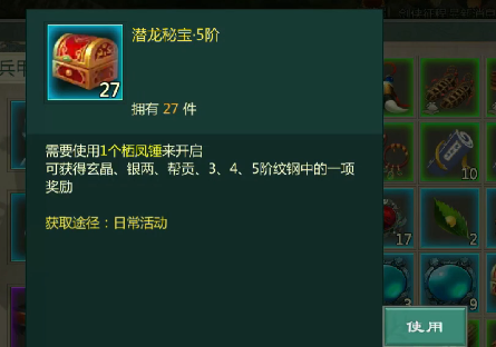 目前在潜龙秘宝中就只可以开出这些道具的奖励,而每次开启的话需要消耗一个锤子道具,这个道具可以购买,也可以通过一些挑战来获得。宝箱的获取可以通过日常玩法,角色等级对于阶段有一定的影响。
