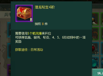 潜龙秘宝在游戏中是有阶段设定的的, 随着阶段的提升,奖励品级以及数量上是有一些提升的。目前是有一阶到8阶这个设定,8阶的话在获取难度上还是有一些难度的。