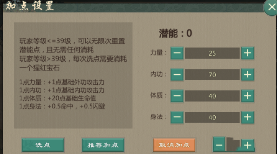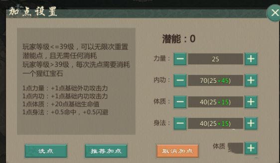 那么可以看到不同的基础属性加强是有区别的, 玩家在加点的时候要做好取舍。如果说不知道怎么加点的话,可以直接使用系统的推荐加点,这个综合是相对均衡的。另外如果加错点想要进行重置的话,在39级之前重置是完全免费的。但是在过了39级之后,每次重置就要消耗一个猩红宝石了。所以说在前期尽量将各种套路都试一试,找到适合自己的加点。