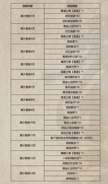 在本次活动期间累计进行登录可以获得黄金心法符印、极秘卷宗、刻印金书、招财聚宝等奖励。