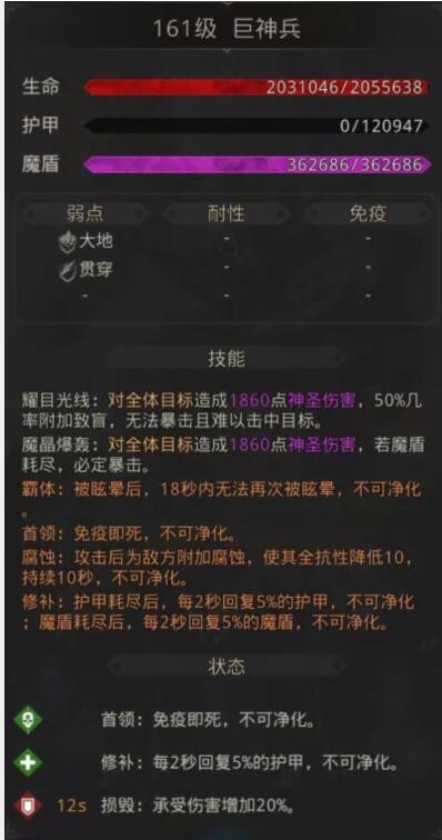 地下城堡3魂之诗游戏中秘境是地堡三主要玩法之一,很多玩家想知道秘境五最终boss巨神兵技能属性是什么,下面,游戏爱好者小编就为大家准备了关于这方面的详细攻略,一起来看看吧!