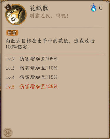 向敌方目标丢出手中的花纸,造成攻击100%伤害。