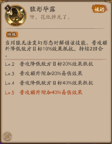 当川猿无法变幻形态时解锁该技能。普攻额外降低敌方目标10%效果抵抗,持续2回合