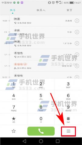 1)首先打开【拨号】应用,进入拨号界面后点击右下角的菜单图标,出现二级菜单后点击【设置】。(如下图)