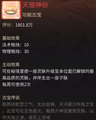 效果:可消耗一定数量的如梦令,夺天地灵气、聚灵成脉,将任一灵脉的品质提升至本位面已解锁的最高品质,同时伴生出一座子灵脉。子母灵脉只有使用该古宝的大能及其同宗门的仙友方可进行采集。