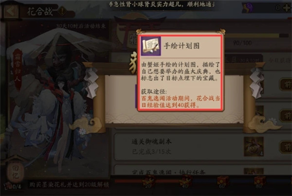 1、在百鬼逸闻活动期间,在玩家花合战当日的经验到40即可得到手绘计划图。