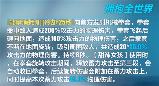 [能量消耗:0][冷却:25秒]向前方发射机械拳套,拳套 命中敌人造成200%攻击力的物理伤害,拳套飞起后 砸向地面,造成100%攻击力的物理伤害,之后拳套 不断在地面旋转,吸引周围敌人,共造成20*25.0% 攻击力的物理伤害。持续8秒。【甜辣女孩】使用时 ,在拳套旋转攻击期间,释放蓄力攻击至第三段,会 自动收回拳套,后续旋转伤害会附加在蓄力攻击上, 同时提高本次蓄力攻击45.0%物理伤害。
