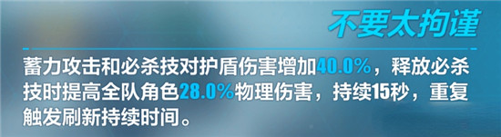 蓄力攻击和必杀技对护盾伤害增加40.0%,释放必杀技时提高全队角色28.0%物理伤害,持续15秒,重复触发刷新持续时间。