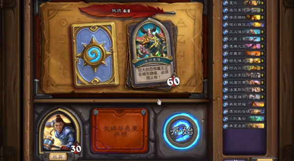 和爹对战。对方英雄技能是被动效果,随从死亡增加护甲。这个效果挺废的,对场面几乎没有什么影响。对面的甲和血条都挺厚的,但是一旦场面落后就只是时间问题了。