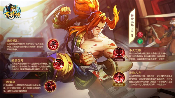 游戏中,石秀舍生取义的特点也体现了出来:当他化身为“拼命三郎”时,将消耗自身当前生命值对身前一定范围内的所有敌方造成伤害,并对受到伤害的敌方单位附加“撕裂”效果(每秒损失一定自身最大生命值,造成真实伤害,持续数秒)。有这样浴血奋战的队友,定能助大家奋勇向前,战无不胜!
