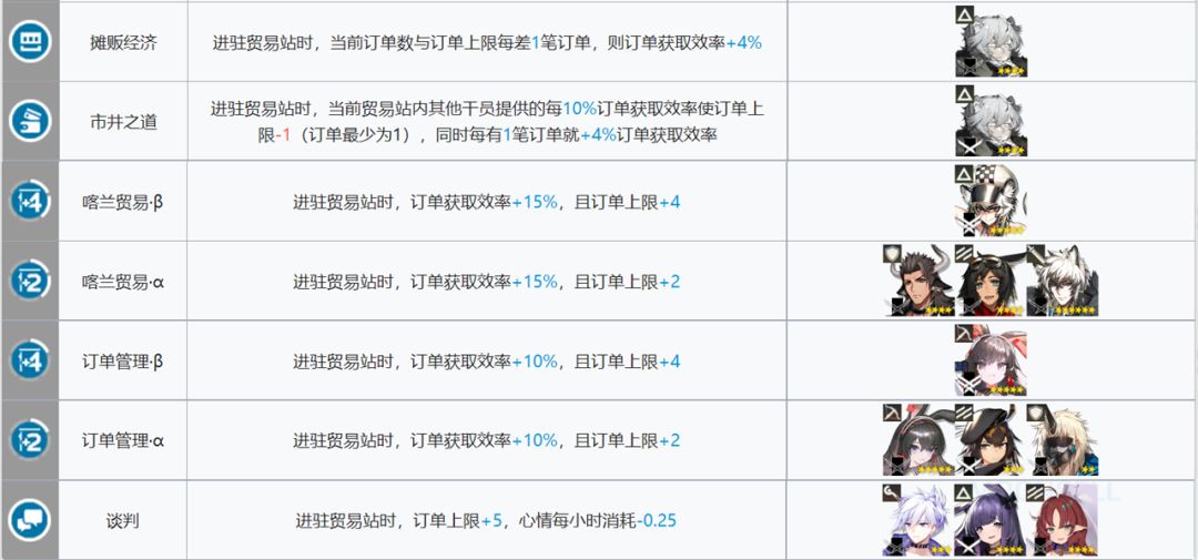 常规贸易站搭配(4):如今贸易站的优秀体系越来越多,一些原本优秀的干员也只能退居二线了。这里推荐一些加成在30%的水平线上,适合作为替补轮班的干员,包括:初始的月见夜、空爆、古米、夜刀、慕斯,精英一的芬、夜烟、缠丸、安比尔,精英二的空、可颂、拜松。她们中的三人打包入驻,最终效率是:90%的获取速度。