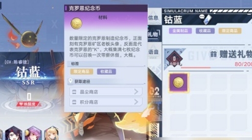 赠送拟态角色礼物的时候需要注意,需要按照他的喜好进行礼物赠送。例如钻蓝喜欢的是金属制品,收藏品,限定商品。因此我们可以送其克罗恩纪念币。一旦送错,唤醒值就只能得到少量的提升。