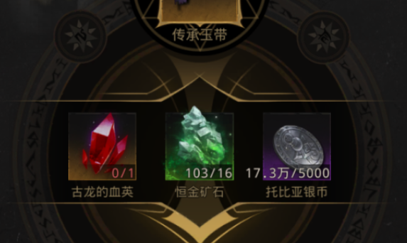 1、古龙的血英是传承玉带的升级材料之一,影法师的传承玉带升级材料需要恒金矿石、银币和古龙的血英;