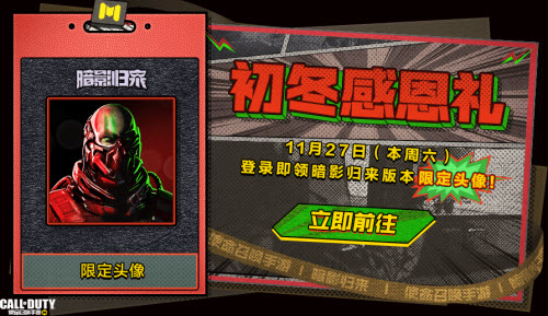 11月26日(本周五)参与初冬感恩礼活动即可获得暗影归来版本限定头像-代号:L!