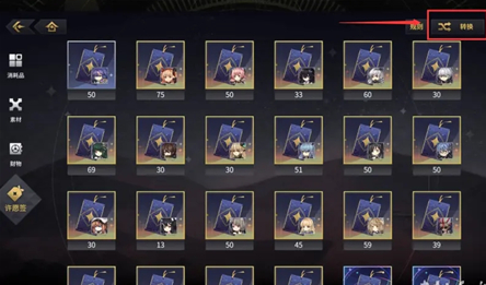 来源:如图,于仓库→许愿签→右上角转换处,将溢出的角色碎片转换成轴线
