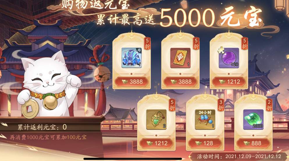 1、在12月9日更新后至12月12日期间,花火商城开放神秘,每日集市会刷新随机的商品,玩家购买后可以获得元宝返利,最高可获得5000元宝;