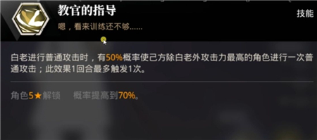 可以看出,两个回合就可以打出很高的一个伤害了,而这还不够,你再来看白老的这个技能(教官的知指导)它可以使除白老外攻击力最高的角色进行一次普通攻击