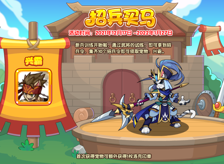 新兵训练开始啦,通过武将的试炼,即可拿到招兵令,集齐10个招兵令即可领取宠物:兴霸。