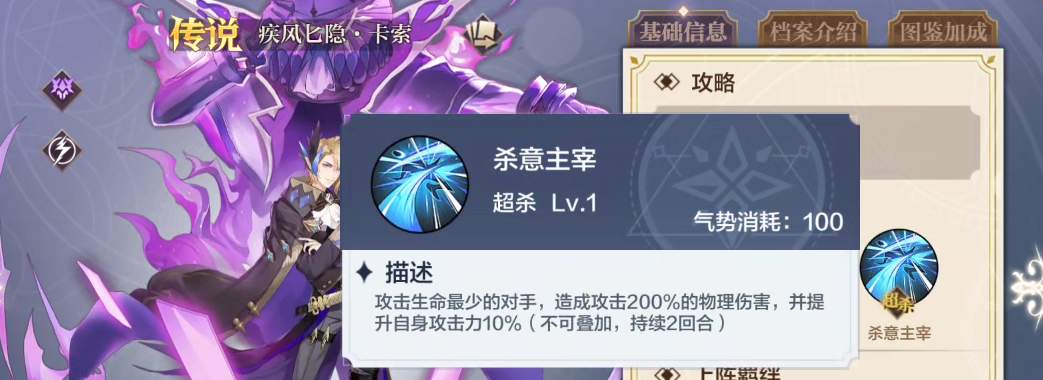 3、超杀技能,杀意主宰,攻击血量最少的敌人造成高额伤害,并提升自身10%攻击力;