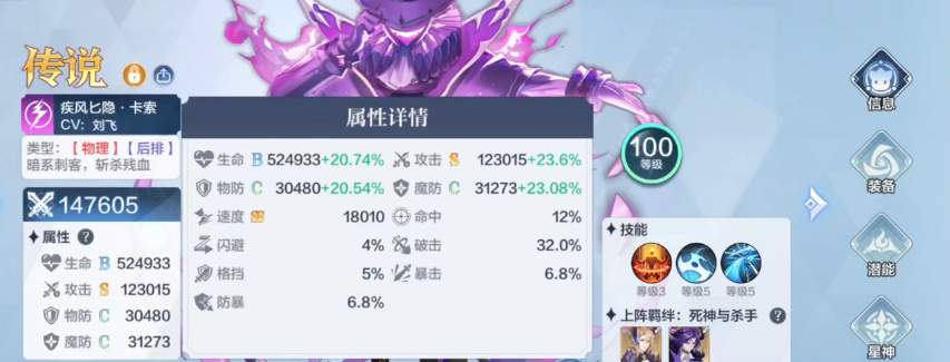 4、角色的整体面板数据可以参考下图所示,SS速度S攻击C双抗B生命,破阵十分强势,不过自身的血量抗性成长很差,也是刺客类角色的通病了;