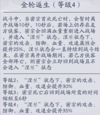 消耗血量对敌方造成范围伤害,三技能会让密宗快速进入“涅槃”状态,且涅槃后不在扣血,冷却也会大幅减少。
