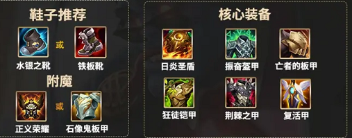 3、后续装备为亡者的板甲和狂徒铠甲,板甲可以增加血量和护甲值以及少量移速提高生存能力。被动可以提高移速并且对敌方造成魔法伤害。狂徒铠甲能够提供大量生命值和生命恢复,极大的提升了蒙多的生存能力。