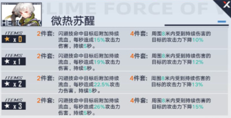 4件套:周围8米内受到持续伤害的目标的攻击力下降10/12/13/15%
