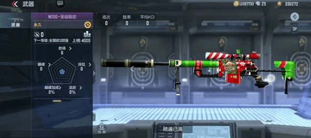 这把武器我记得最开始是可以白嫖获取的,具体的获取途径好像是通过某次助力活动就能获取,现如今加上抵用券720钻石就可以拿下了。这把狙的枪身被红绿色圣诞元素包裹封,烘托出了浓厚的圣诞氛围 在为数不多的M200系列里面,这把武器的颜值和性能也是数一数二的。