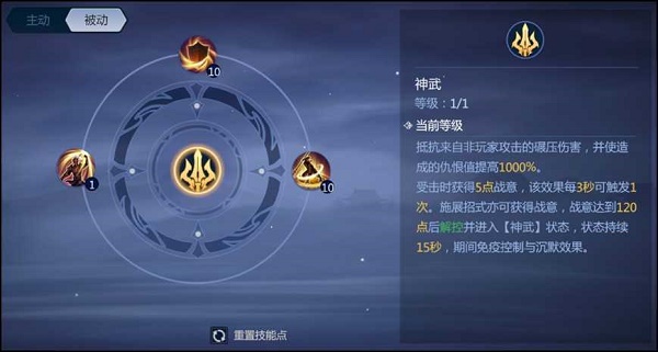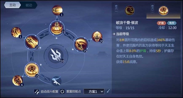 破浪千叠:天王一技能,不论是PVP或者PVE都是及其重要的技能,主要护盾期间的的免控效果在各类活动中都非常好用,建议加满。而被动可以根据情况和技能点是否富余进行加点。