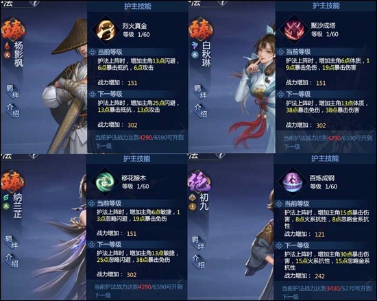 这一类的选择是建立在初九和凌止获取成功后,其他护法提供的加成主要提供更高的坦度,可以更好的应对各类活动中的情况,提高生存能力。