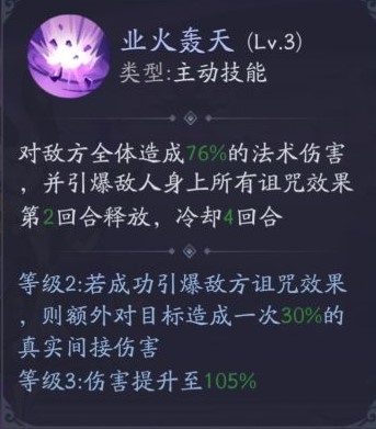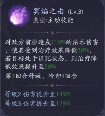 幽冥中最强者当之无愧的是祝融,配合合击技能——山海佳人,伤害爆表,虽然蚩尤伤害更爆表,但是蚩尤有一回合的空档期,祝融容错率更高一点,所以祝融更胜一筹。我们看下祝融的技能:
